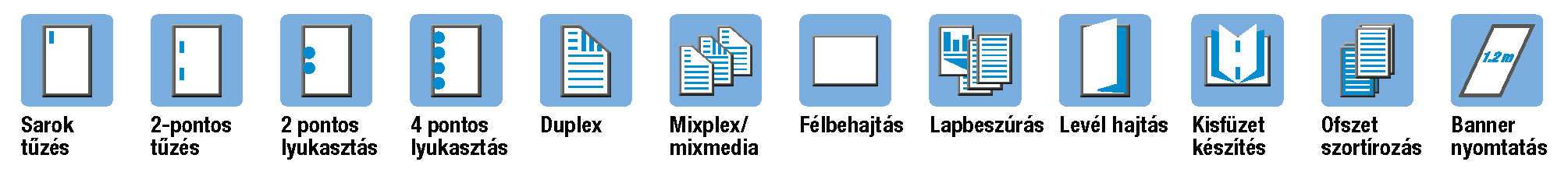 Finishelési módok (opcionális): Eltolás; csoportosítás; szortírozás; tűzés; lyukasztás; közép-hajtás; boríték-hajtás; füzet